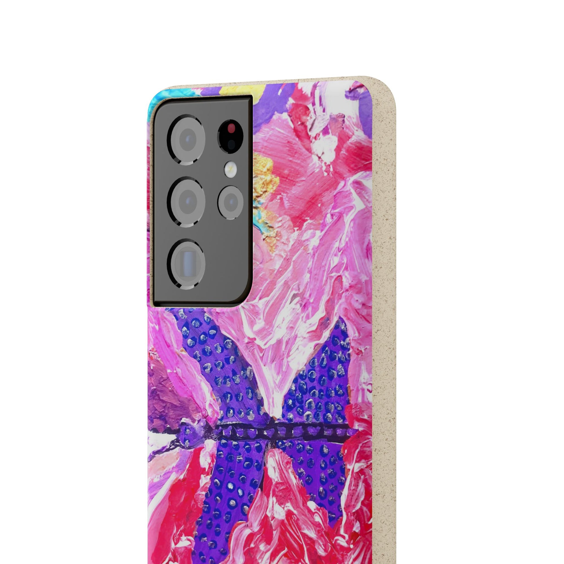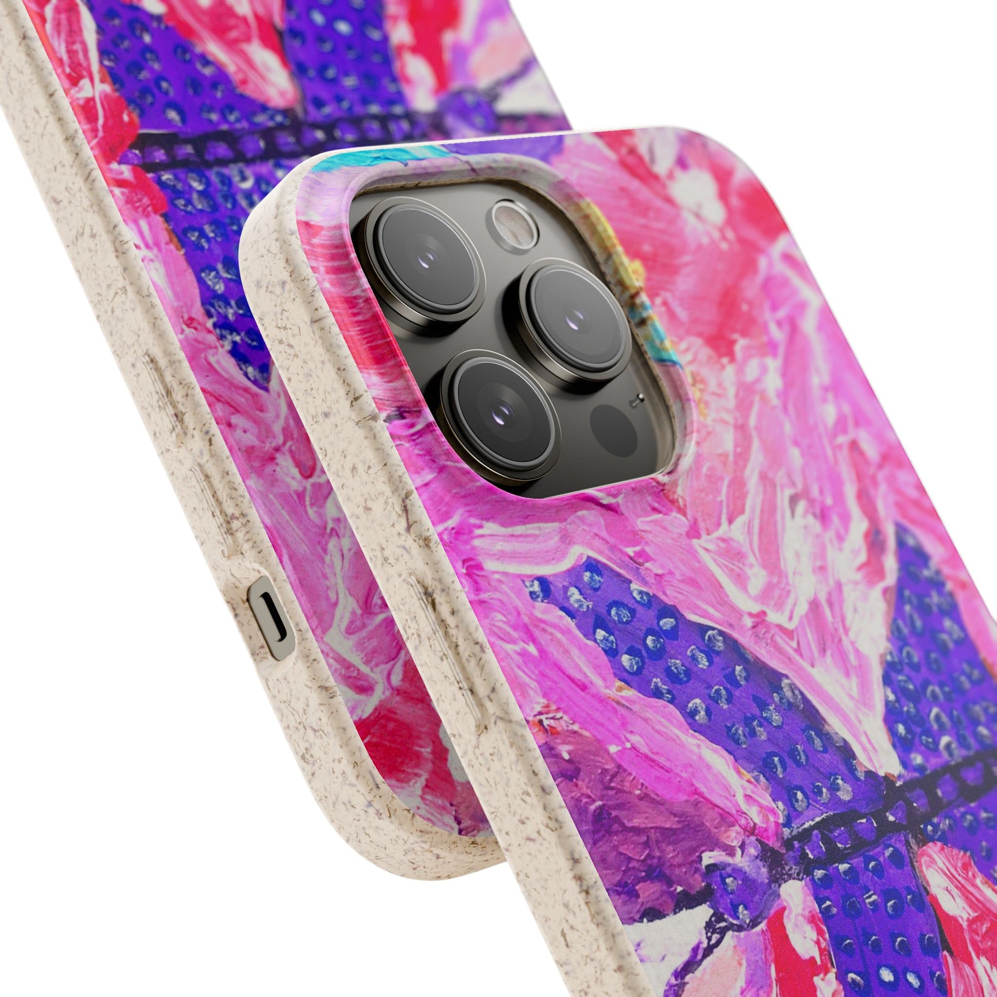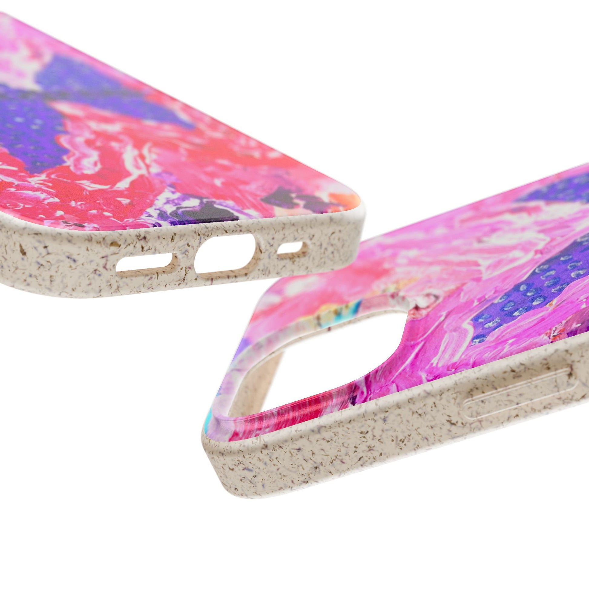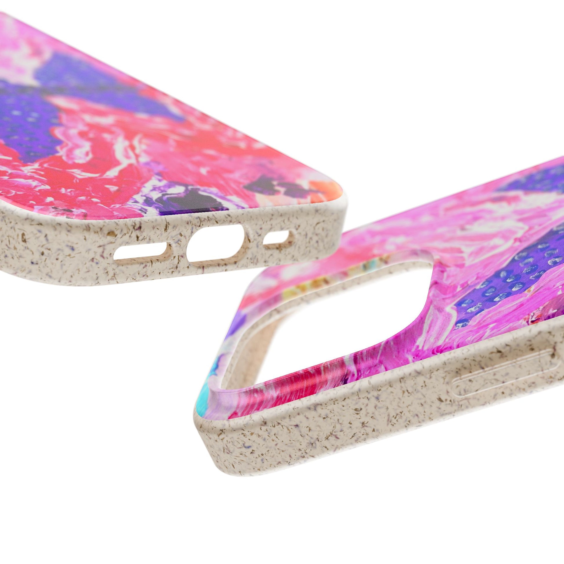 This biodegradable phone case brings bold, painterly color to your daily carry while keeping a low footprint. The matte, frosted finish softens a riot of magenta, coral and indigo brushstrokes into an artful composition that feels both spontaneous and intentional. Lightweight and flexible, the PLA-and-bamboo construction absorbs small impacts and will naturally break down over time — a small, responsible swap for anyone who cares about materials as much as style. Precise cutouts keep cameras and ports ready, and MagSafe® wireless charging works when placed flat on a charger. It may carry a faint natural scent from the bamboo fibers and can be packaged for gifting if you want to present it thoughtfully.