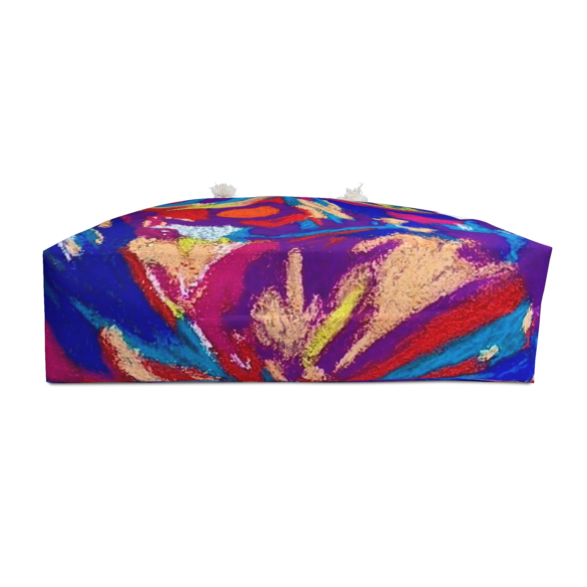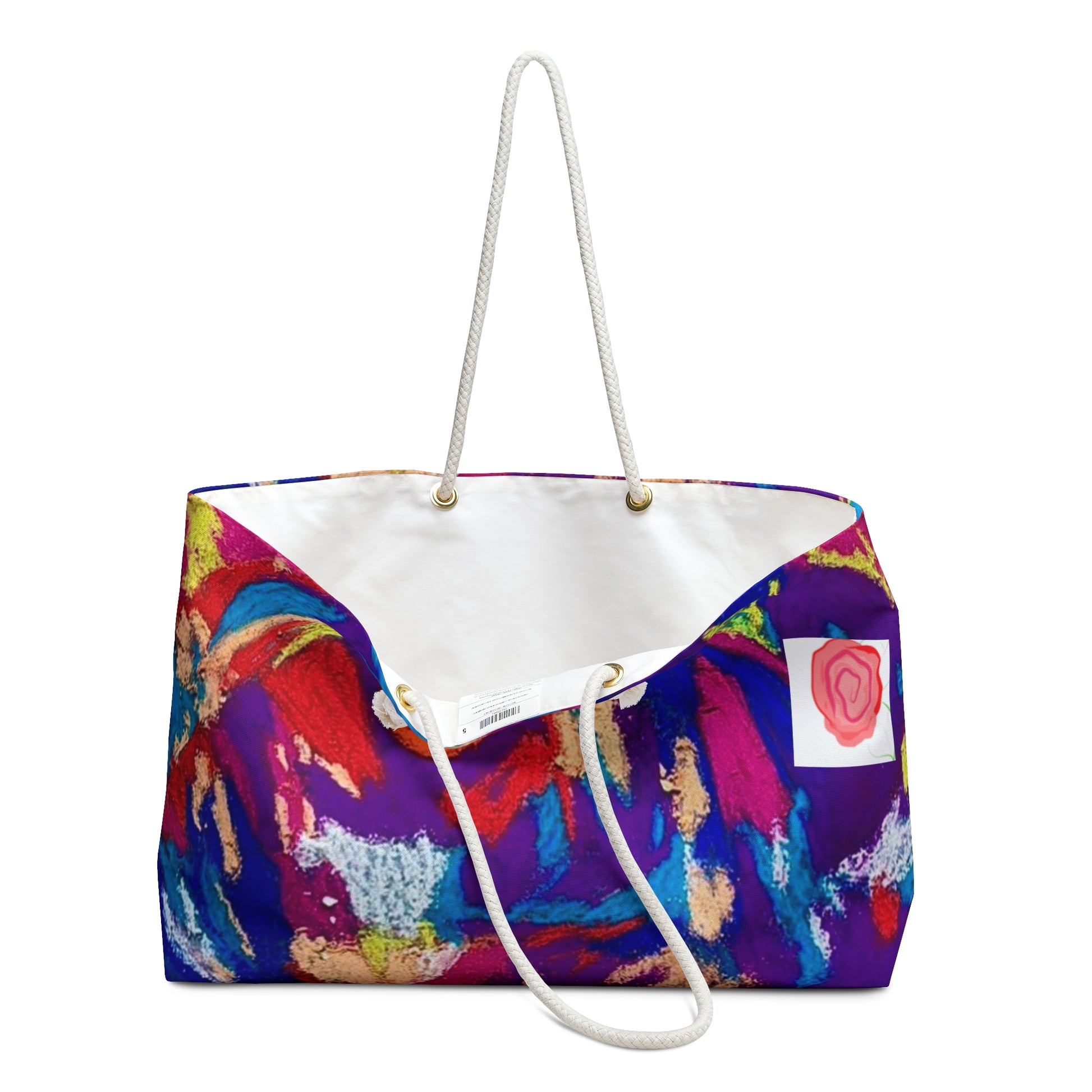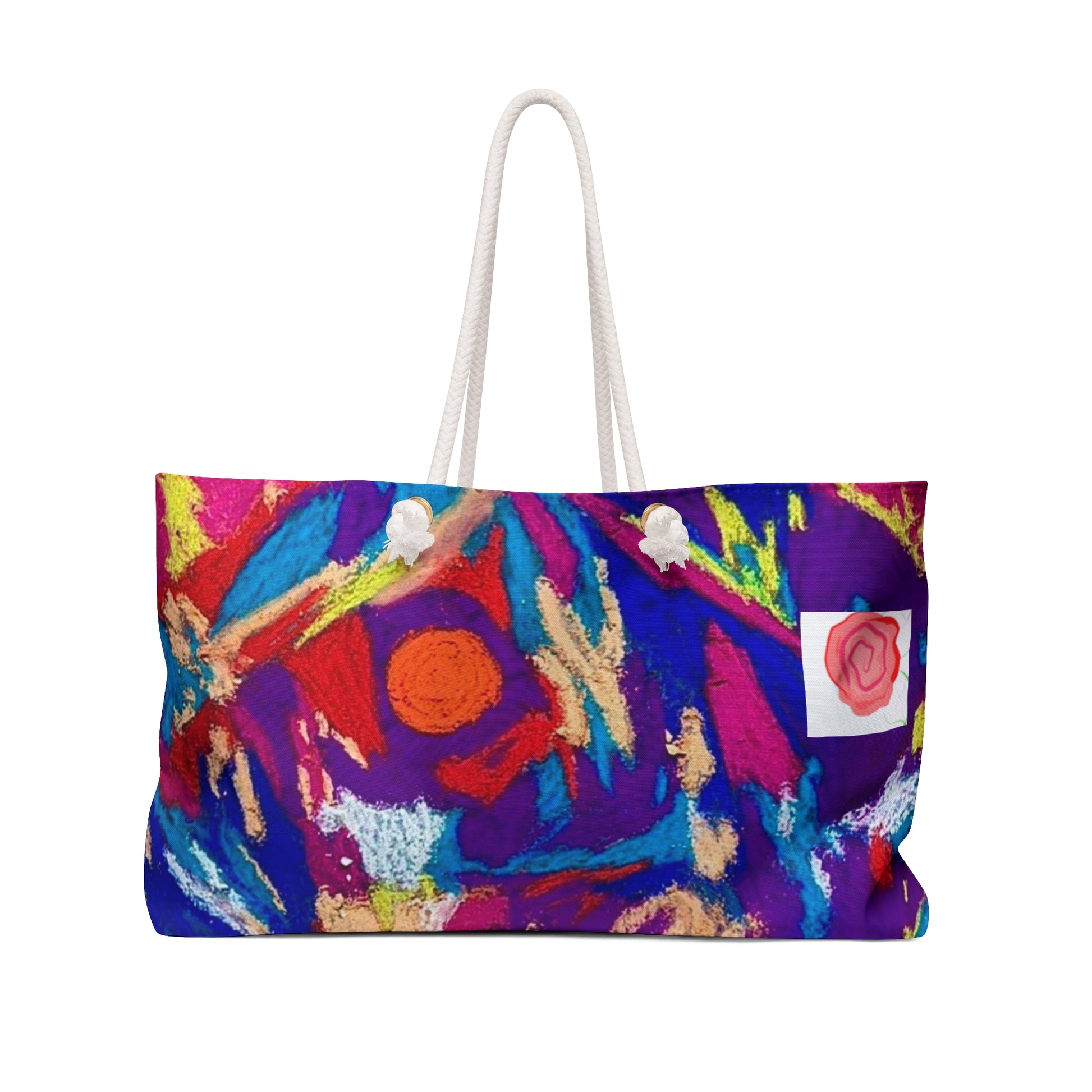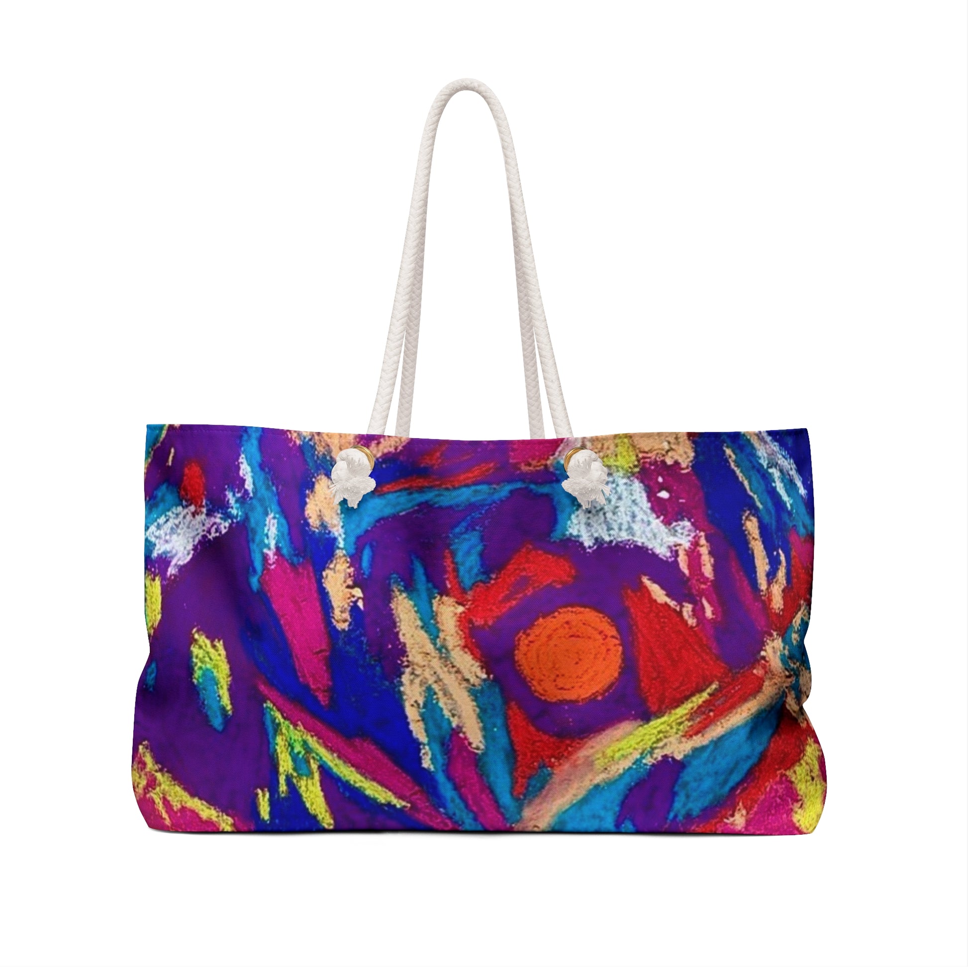 This Weekender Bag features an abstract artwork called 'bollywood sunset' printed on the exterior, making it a bold fashion statement. The vibrant colors pay homage to Bollywood cinema, giving off a loud and unapologetic vibe. Perfect for travelers looking to stand out and add a pop of color to their wardrobe. Ideal for those who love colorful and expressive designs, suitable for vacations, weekend getaways, and trips to festivals.