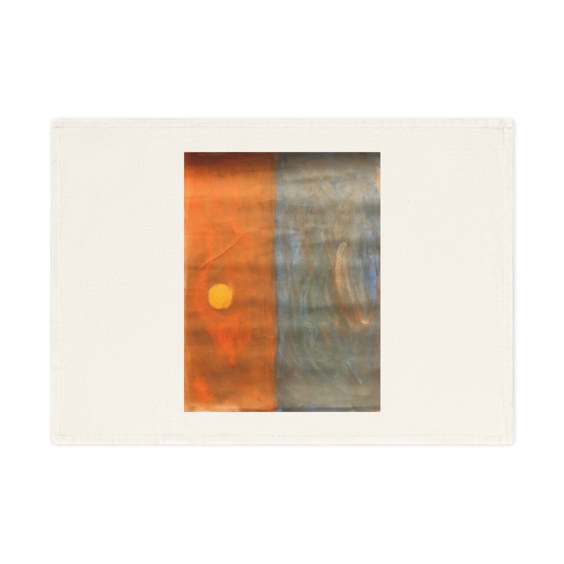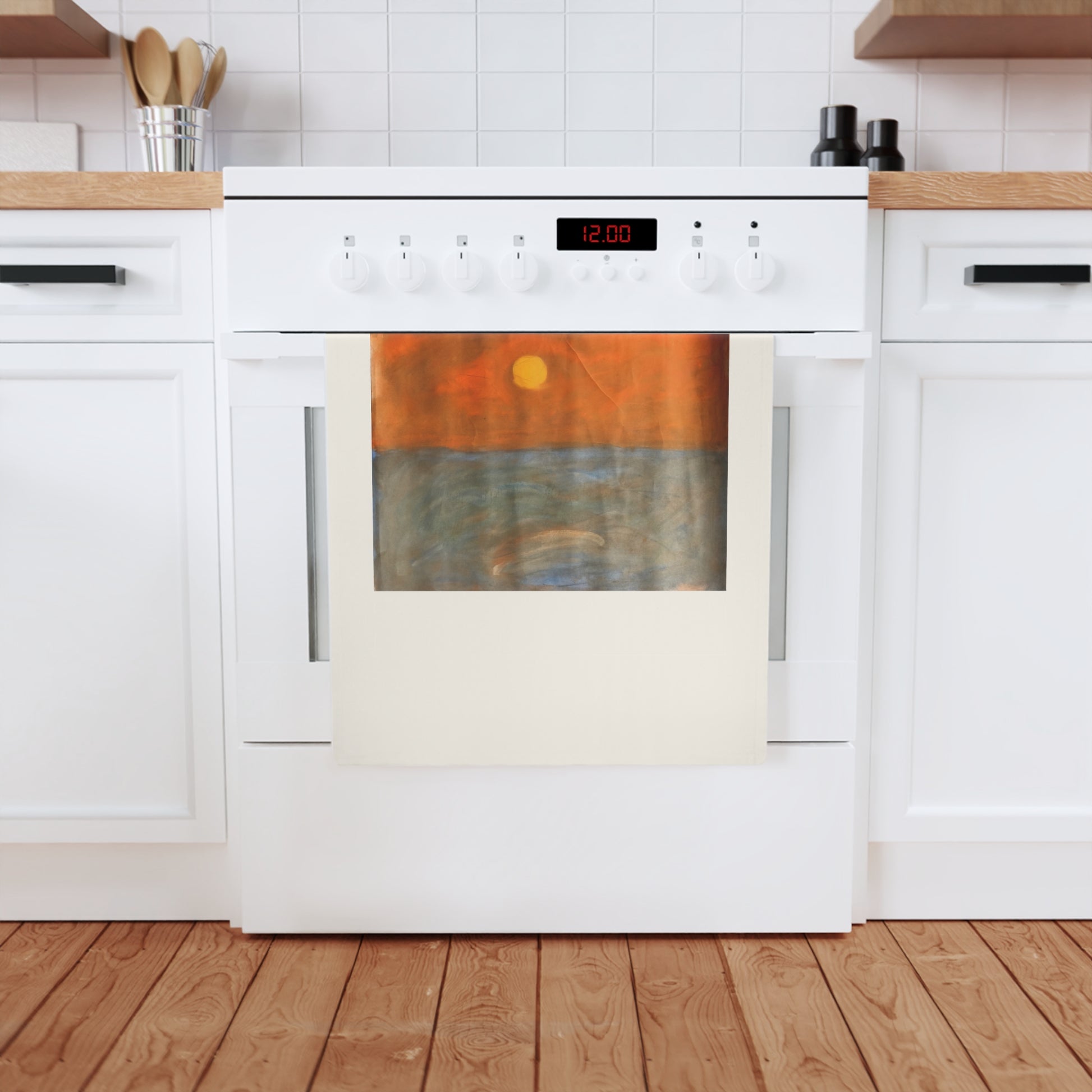 Soft, organic cotton tea towel printed with a painterly sunset-over-water scene. The warm orange sun and muted blue-gray waves bring a quiet, contemplative mood to kitchen tasks. Lightweight and fast-drying, it layers easily over an oven handle, hangs by the sink, or brightens a small breakfast nook. Hemmed edges and a sewn-in care label give it a lived-in, durable feel — something that ages gracefully with daily use.