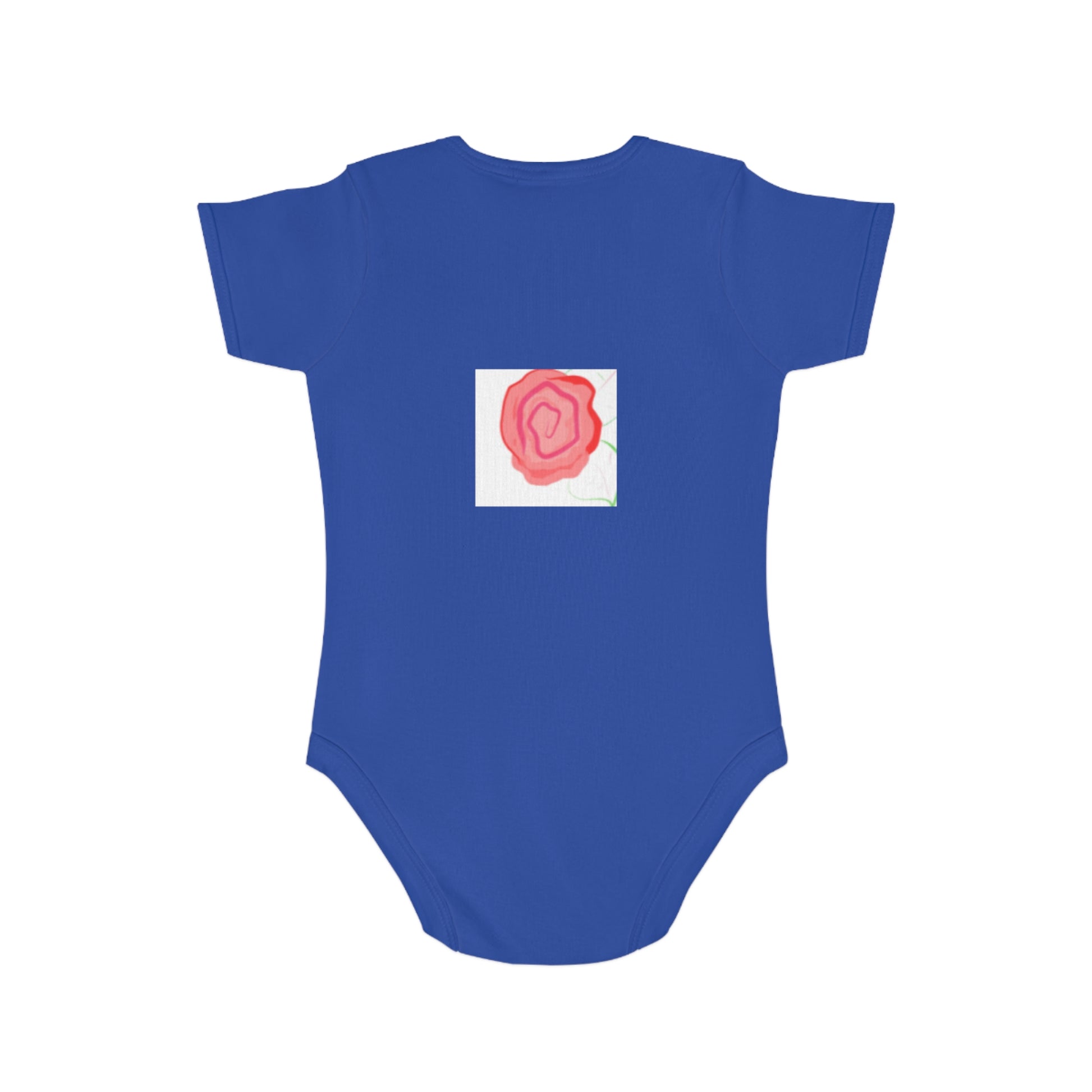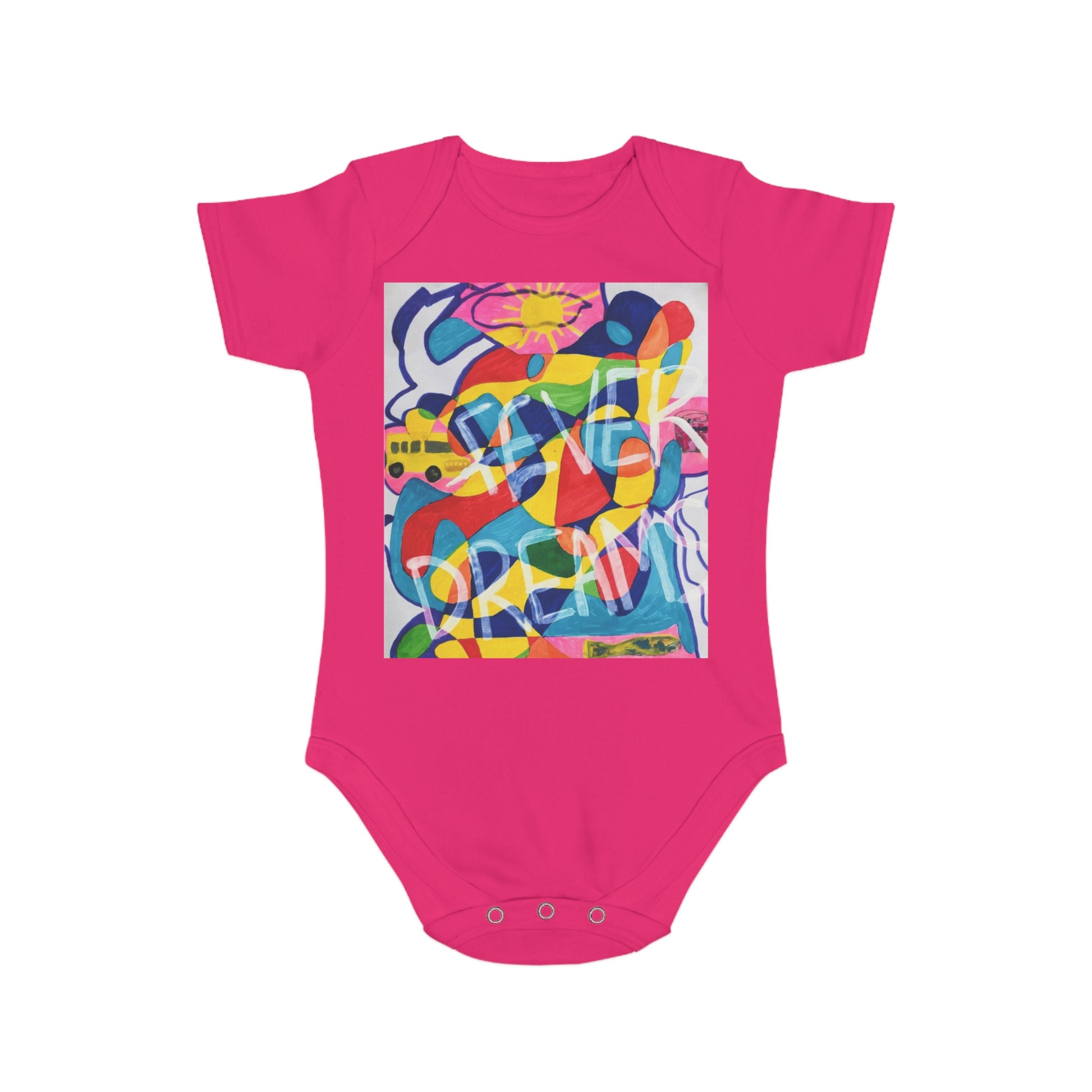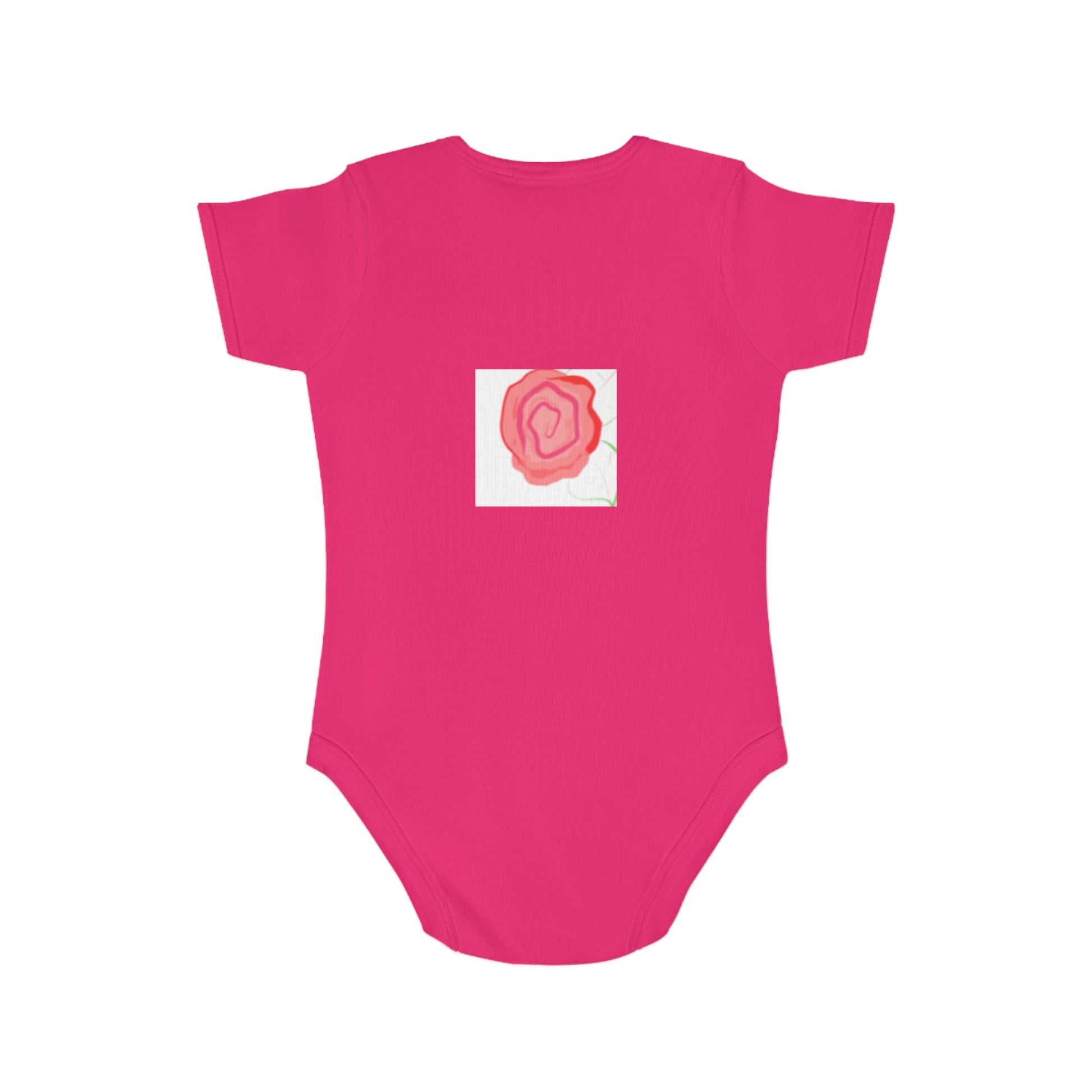 A bright, playful baby bodysuit that brings a splash of modern color to everyday babywear. The front features a bold, abstract print with layered shapes and cheerful tones that read like a tiny piece of contemporary art. On the back, a delicate rose motif adds a soft, hand-painted touch for moments when baby turns around. The fabric feels comfortably sturdy yet breathable — made from sustainably sourced 100% cotton — and the envelope neck and YKK snap closure make dressing and changing quick and gentle. Machine-friendly construction with sewn-in labels and heat-press print keeps the design vibrant through washes. This bodysuit sits easily in a new parent’s routine: lively enough to brighten playtime photos, gentle enough for nap and cuddle time, and simple to layer under a cardigan or overalls for outings.