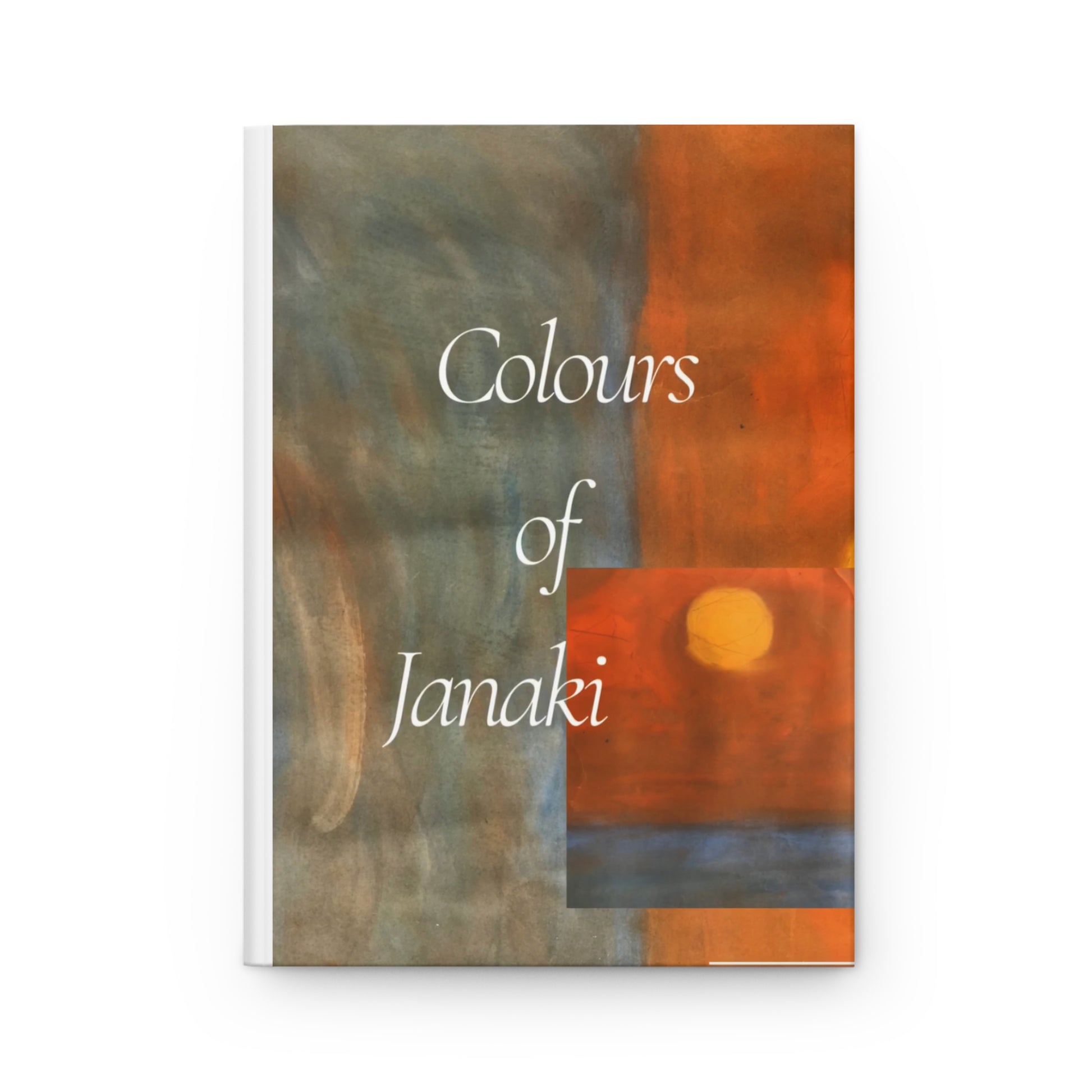 The cover features an original oil painting on paper, creating a delicate texture reminiscent of butter paper—soft yet resilient. Subtle wrinkles symbolize the strength and struggles of Janaki, also revered as Goddess Sita, evoking a serene sky as a tribute to her timeless grace.