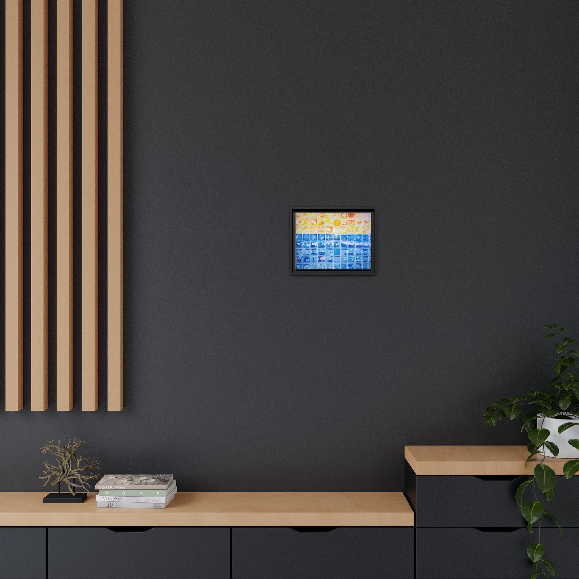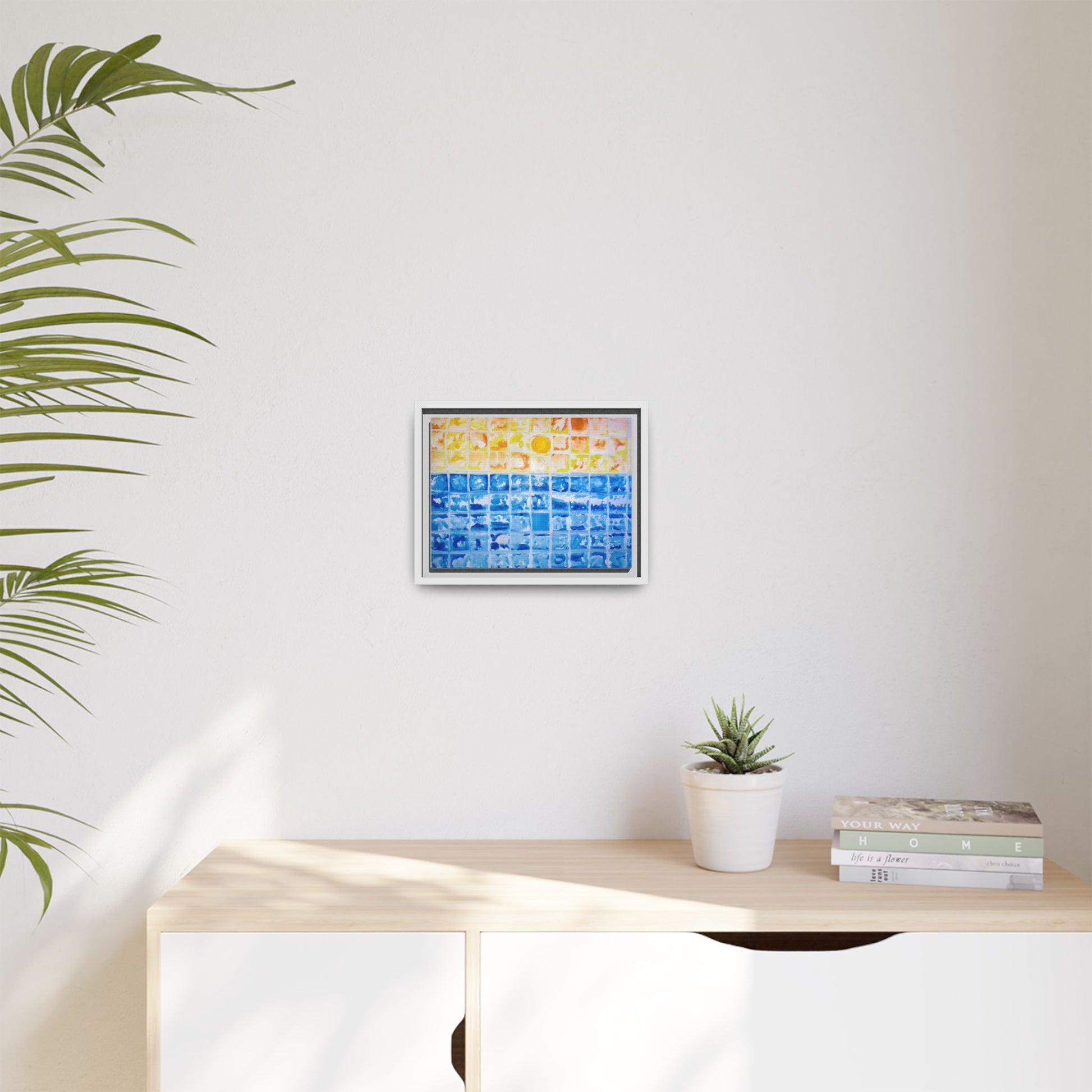 A framed matte canvas print that brings a calm, sunlit rhythm to your wall. The artwork’s mosaic of warm yellows and cool ocean blues reads like a memory of morning light on water — textured, layered, and quietly luminous. The matte finish softens glare and highlights the subtle brushwork, while the slim black pine frame gives the piece a contemporary, gallery-ready presence. Hang it above a sofa, in a hallway, or in a sunlit nook to anchor a peaceful, coastal-inspired vignette that feels lived-in and thoughtfully curated.