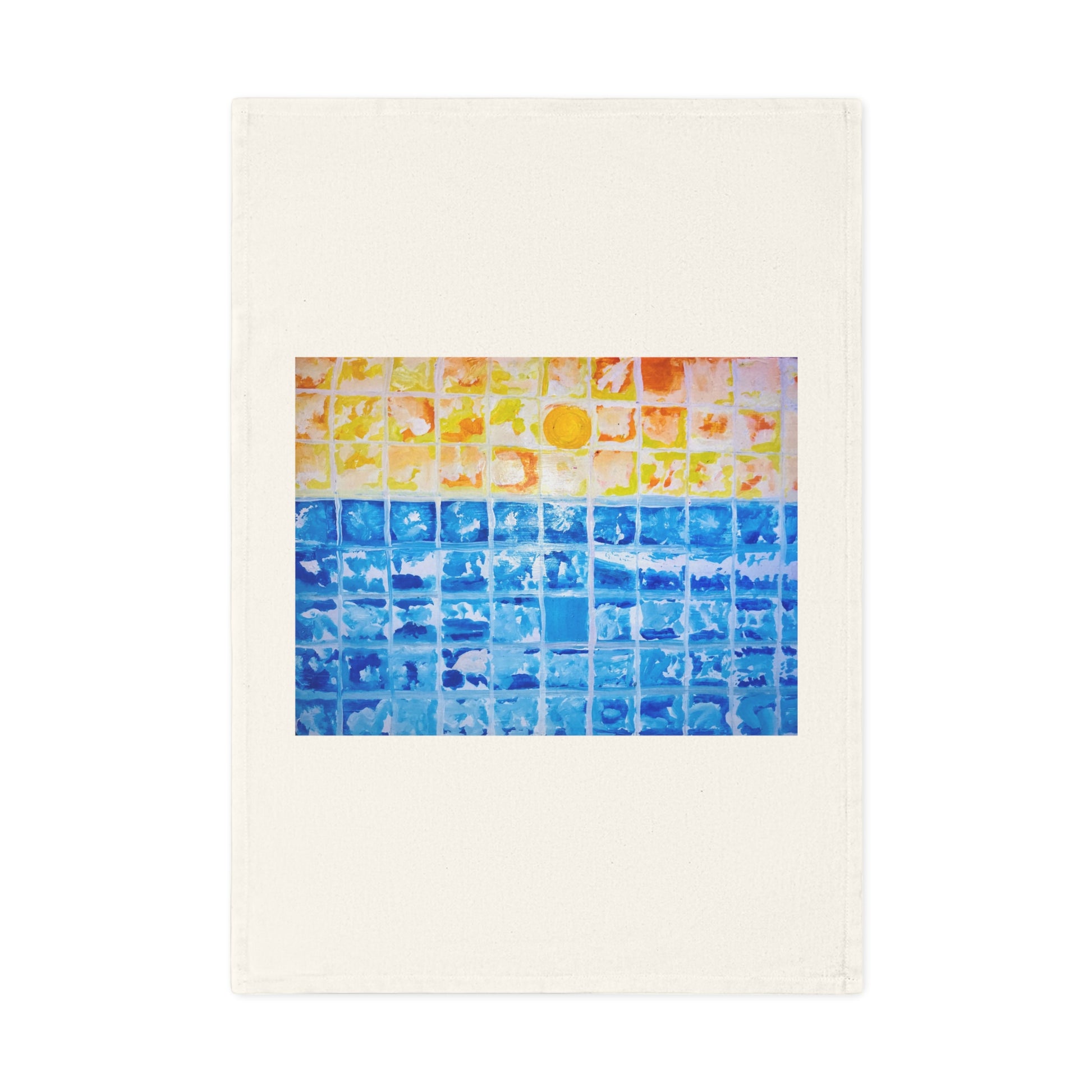 A bright, beach-kissed cotton tea towel that brings a splash of seaside calm to everyday kitchen moments. Hand-drawn tile squares in sunlit yellow and ocean blue arrange into a warm-to-cool gradient that feels like sand meeting surf. Lightweight and soft, it dries quickly and folds easily into the small rituals of morning coffee, dish-drying, or spreading out a quick picnic on a balcony. The printed design has a painterly, watercolor texture—little imperfections and color blooms that make each glance feel like a tiny lighthouse blink. This towel settles into the life of someone who loves slow mornings, coastal colors, and artful everyday objects that wear happily with use.