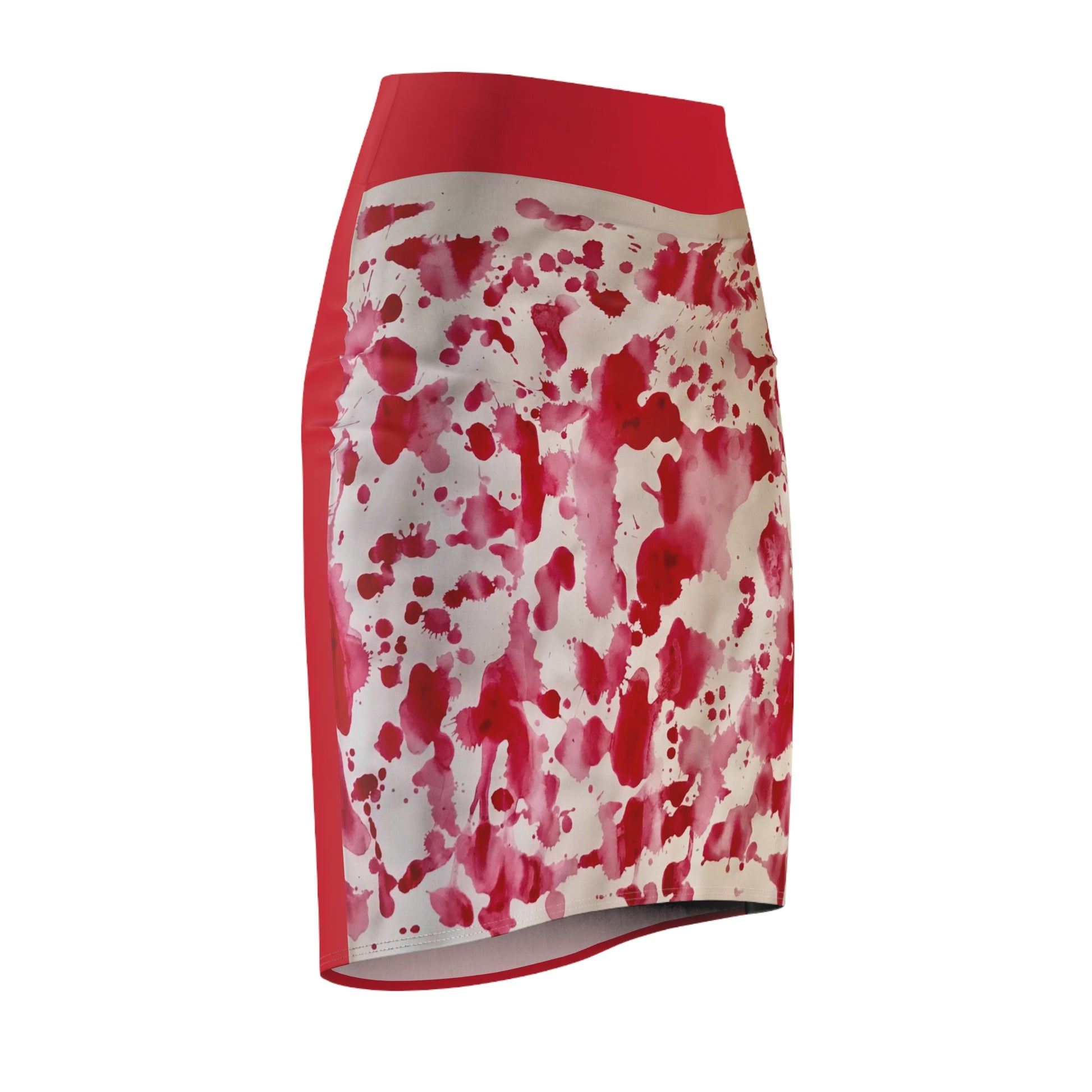 A sleek mid-waist pencil skirt that brings bold color and movement to everyday outfits. The sculpted silhouette hugs curves while the 4-way stretch fabric lets you move comfortably — from desk to dinner. The front panel features an expressive red-and-pink watercolor splash print, contrasted by a solid deep-red back for a clean, modern finish. Lightweight, resilient polyester keeps the dye vivid and the shape resilient. Wear it with a tucked blouse for a confident work look or layered with a chunky knit for relaxed evenings — it moves with you and holds its color through wear.